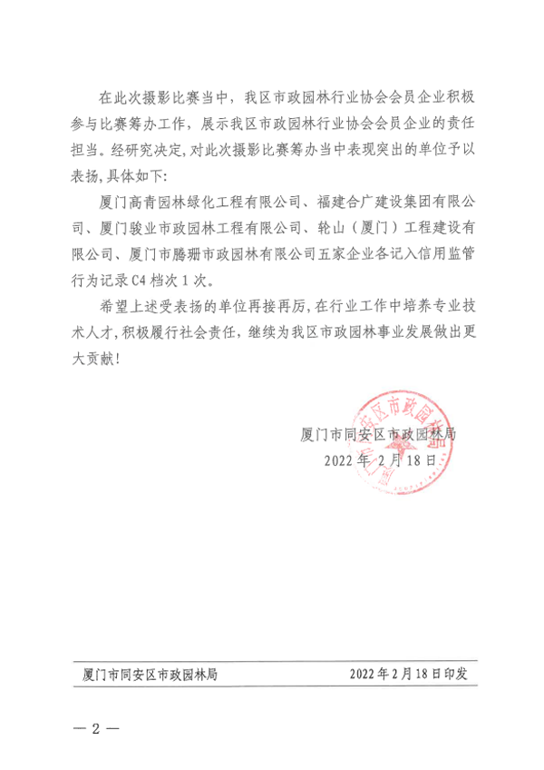 2022.2.18廈門市同安區(qū)市政園林局關(guān)于表彰2021年“同安公園”“同安綠道”攝影比賽籌辦單位的決定